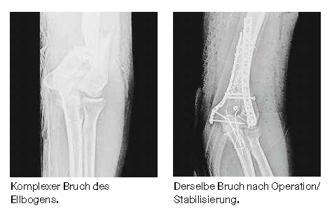 Durch die zunehmende Komplexität der Brüche und der Beteiligung von Weichteilen werden grundsätzlich die benötigten Behandlungen komplexer und die Genesungszeiten länger. Die beiden Röntgenbilder eines komplizierten Bruchs des linken Ellbogens zeigen, welche ausgedehnten, chirurgischen Eingriffe nötig sein können, um die komplexen Verletzungen adäquat zu versorgen.